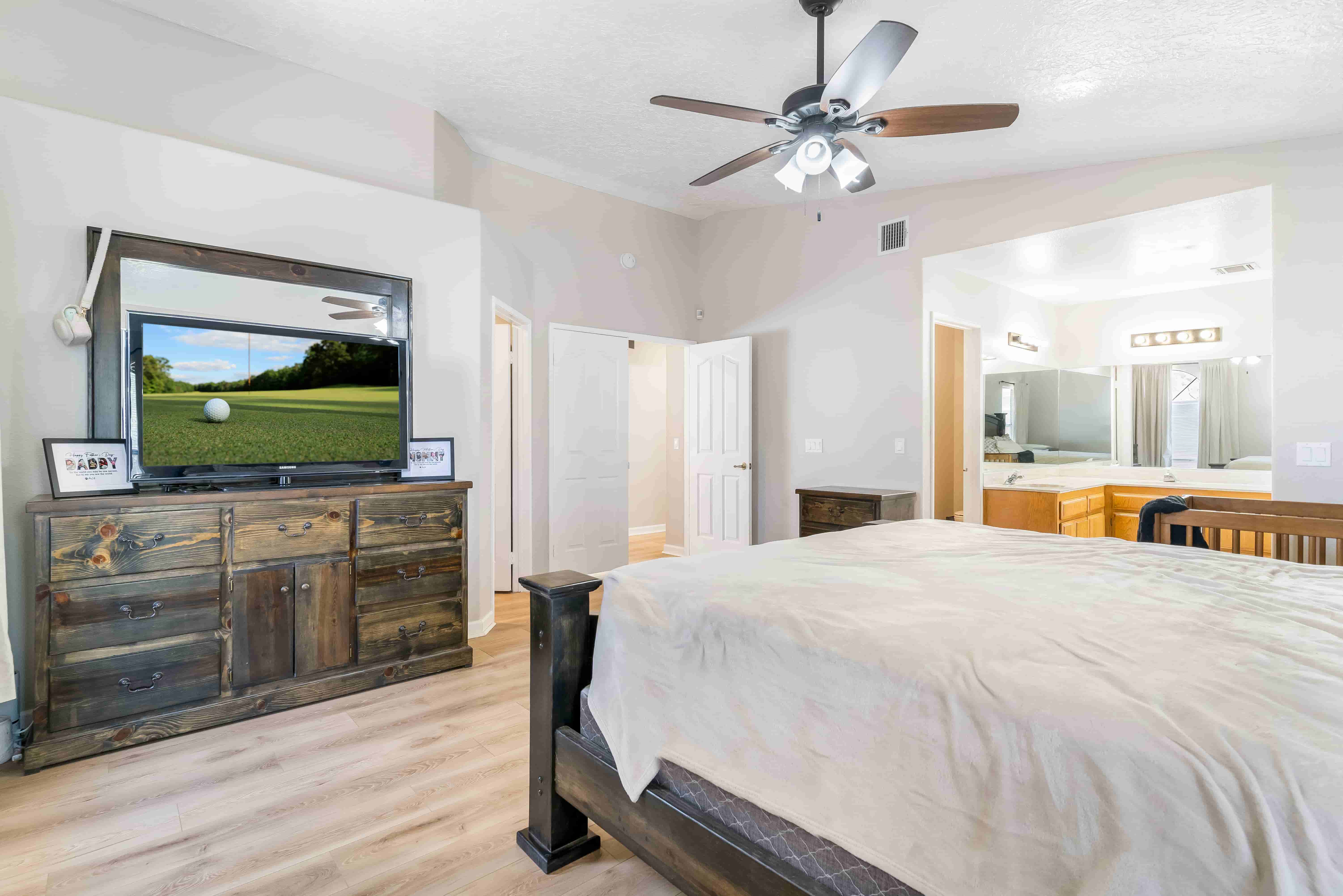 The primary bedroom features a walk-in closet, double-sink vanity, soaking tub, and separate shower. Additional features include an indoor laundry room with gas dryer hookup, attached two-car garage, RV parking, fully fenced backyard, and a storage shed.